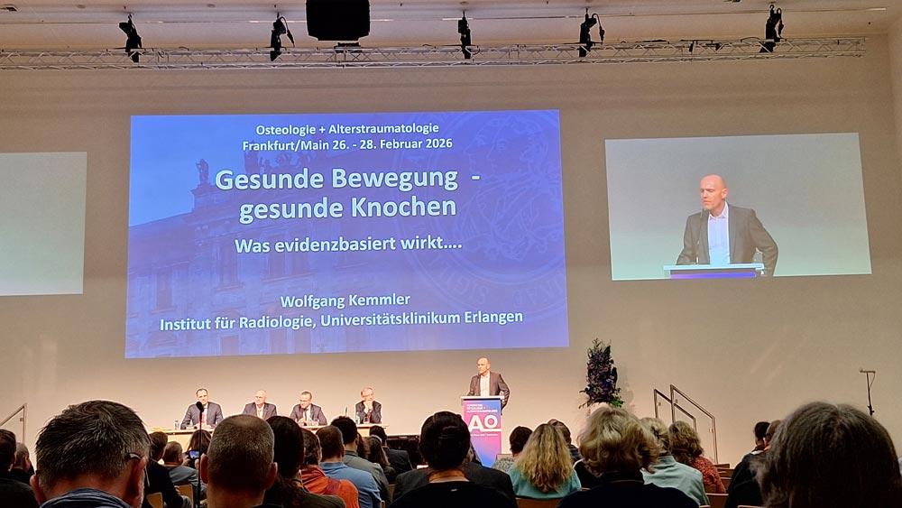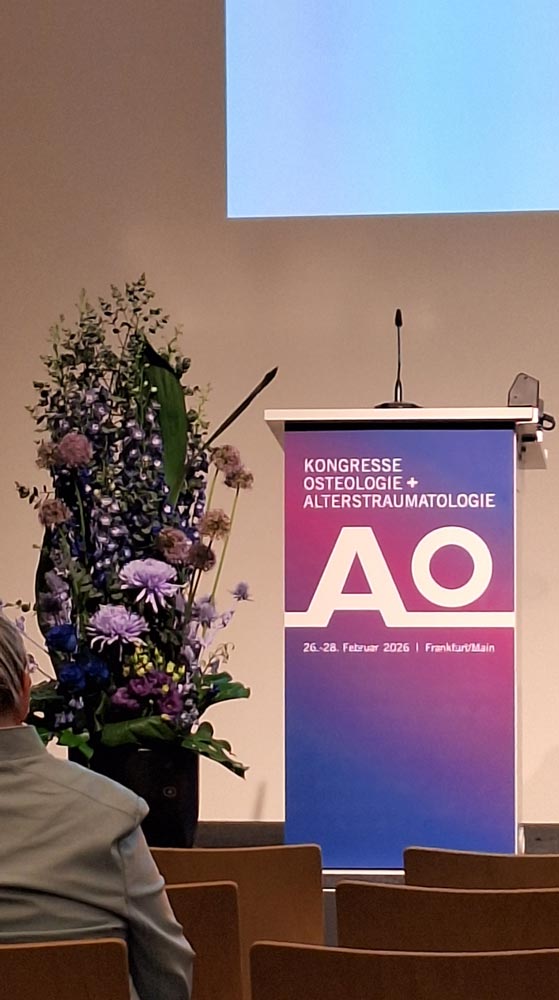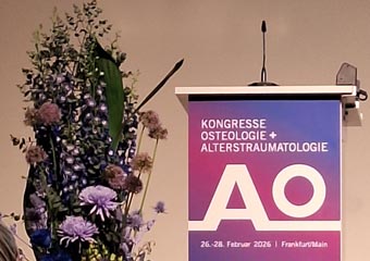 In der Kongresshalle Kap Europa in Frankfurt/Main wurde auch 2026 wieder ein wissenschaftliches Programm auf höchstem Niveau über verschiedenste Erkrankungen des Knochenstoffwechsels und die optimalen Behandlungsansätze geboten. Ein spezieller Schwerpunkt lag diesmal unter anderem auf den Bereichen Sport zur Beeinflussung der Knochenfestigkeit und den Perspektiven für KI in der Osteologie. Dr. Fuchs ließ sich die Gelegenheit nicht entgehen, die neuesten Trends der Osteologie aus erster Hand von den deutschsprachigen Topexperten mit den aktuellsten Forschungsergebnissen präsentiert zu bekommen und danach die Trends und Neuerungen mit den Meinungsbildnern direkt zu diskutieren. Wie immer lassen wir diese Trends direkt in die Versorgung der Patientinnen und Patienten der OrthoTOP einfließen.